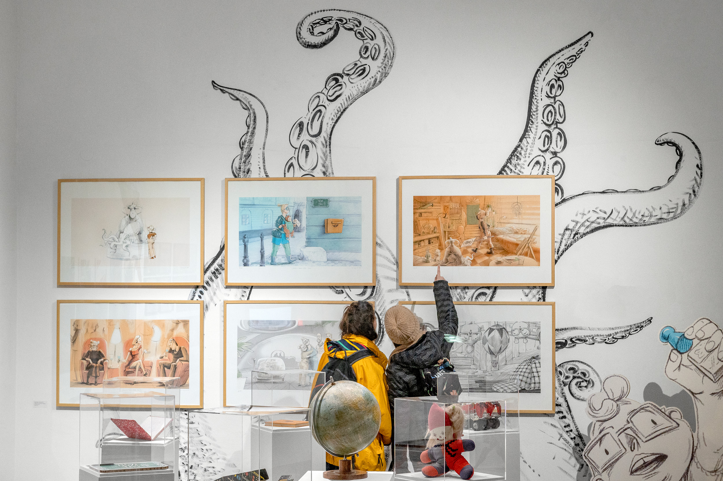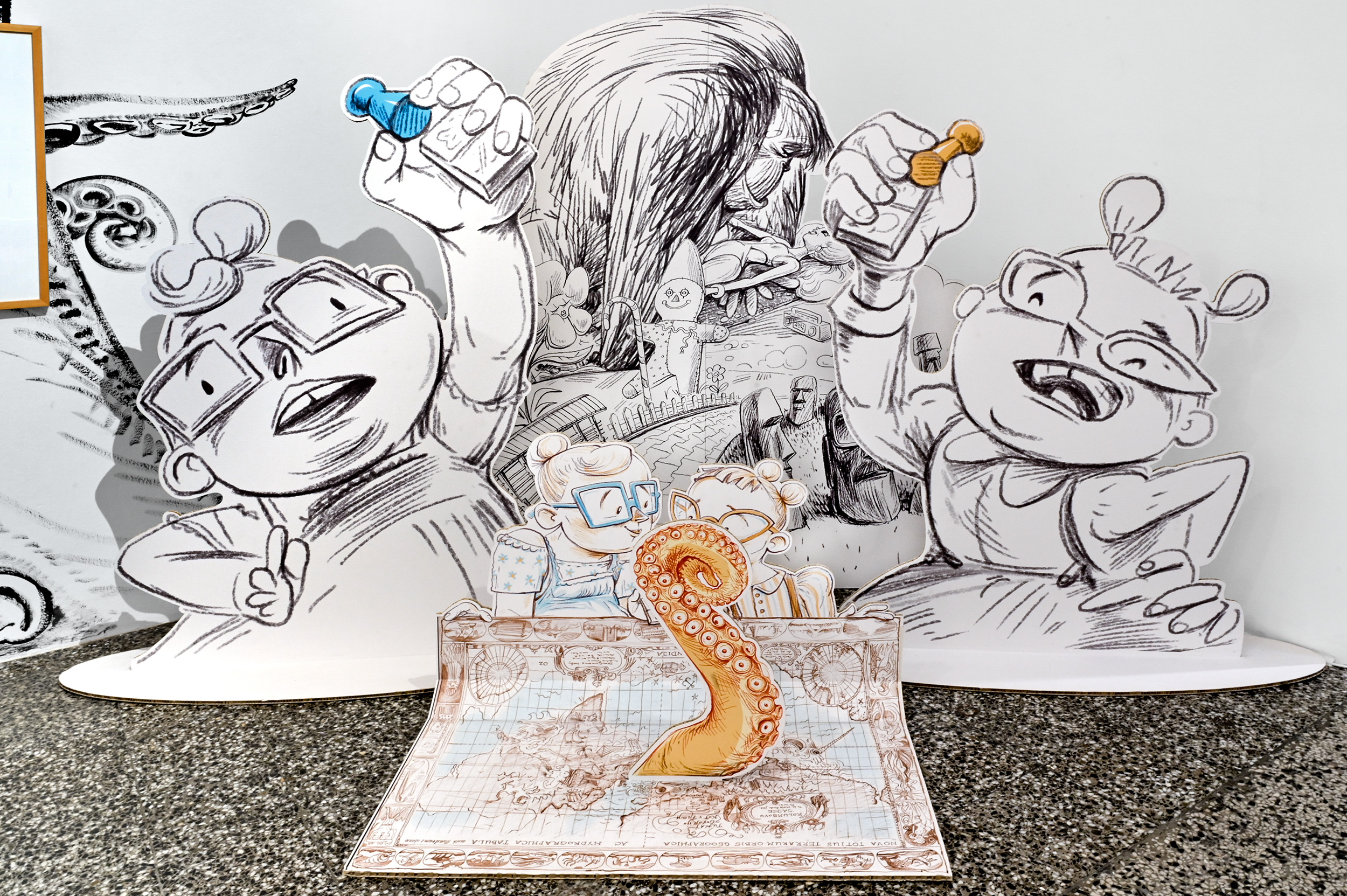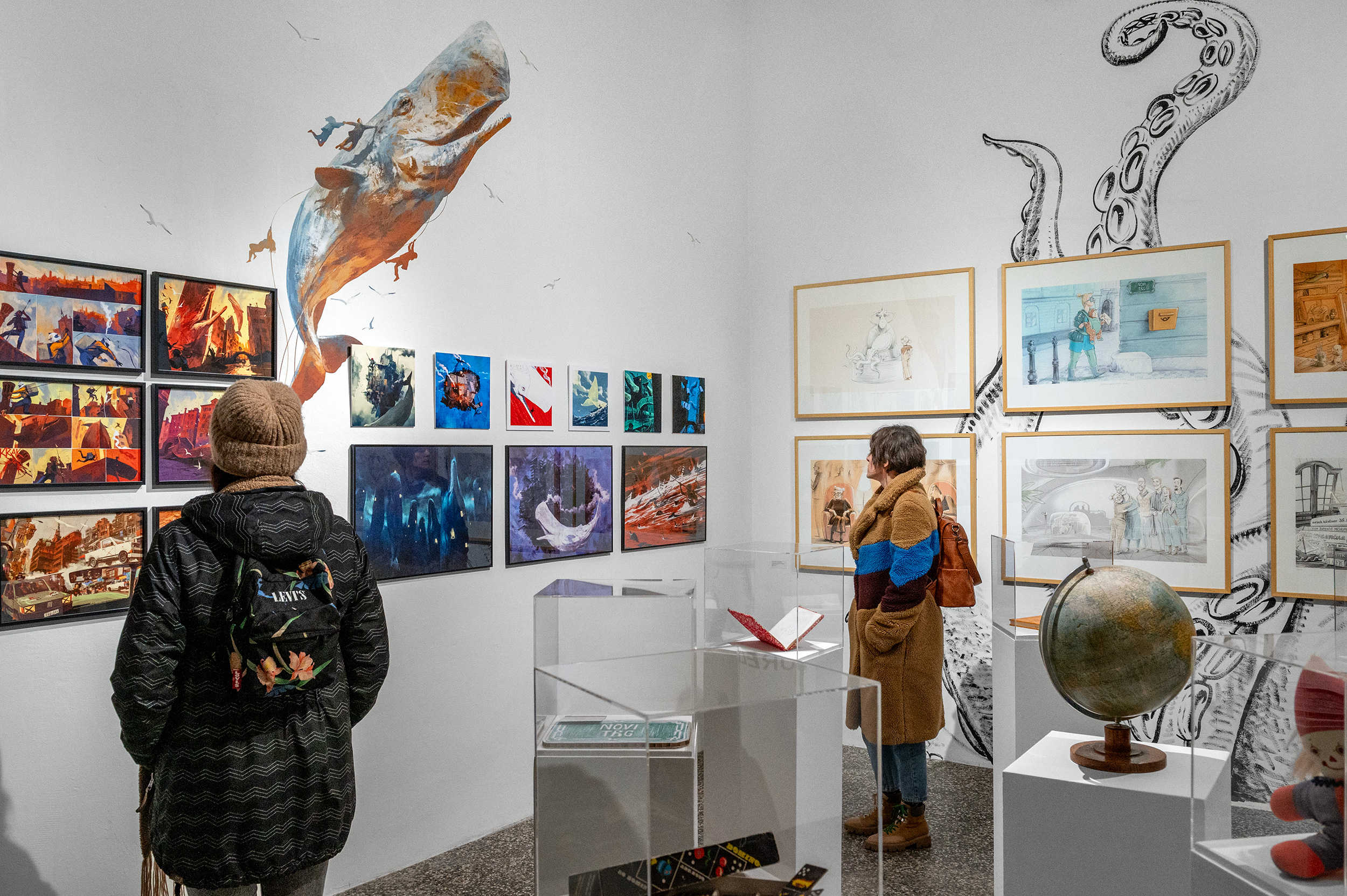 Na razstavi se italijanski stripovski avtor Cosimo Miorelli predstavlja s stripovsko interpretacijo kultnega romana Moby Dick, Milanka Fabjančič pa z animiranim filmom Hobotnica banana mišmaš. Obe deli na svojstven način prikazujeta aktualno družbeno realnost.